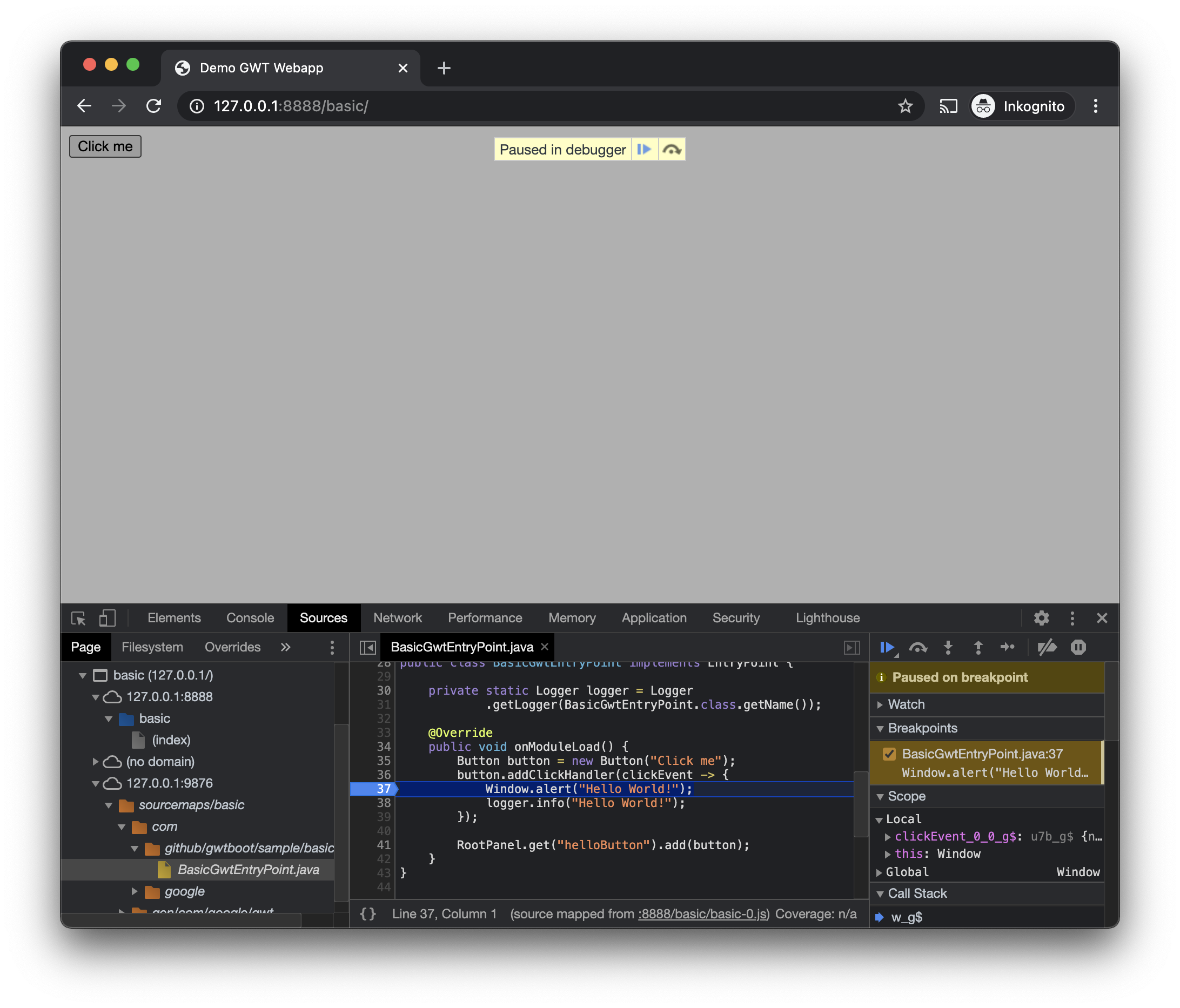You can debug the Java code on the browser with the help of source maps. In this example we use Google Chrome.