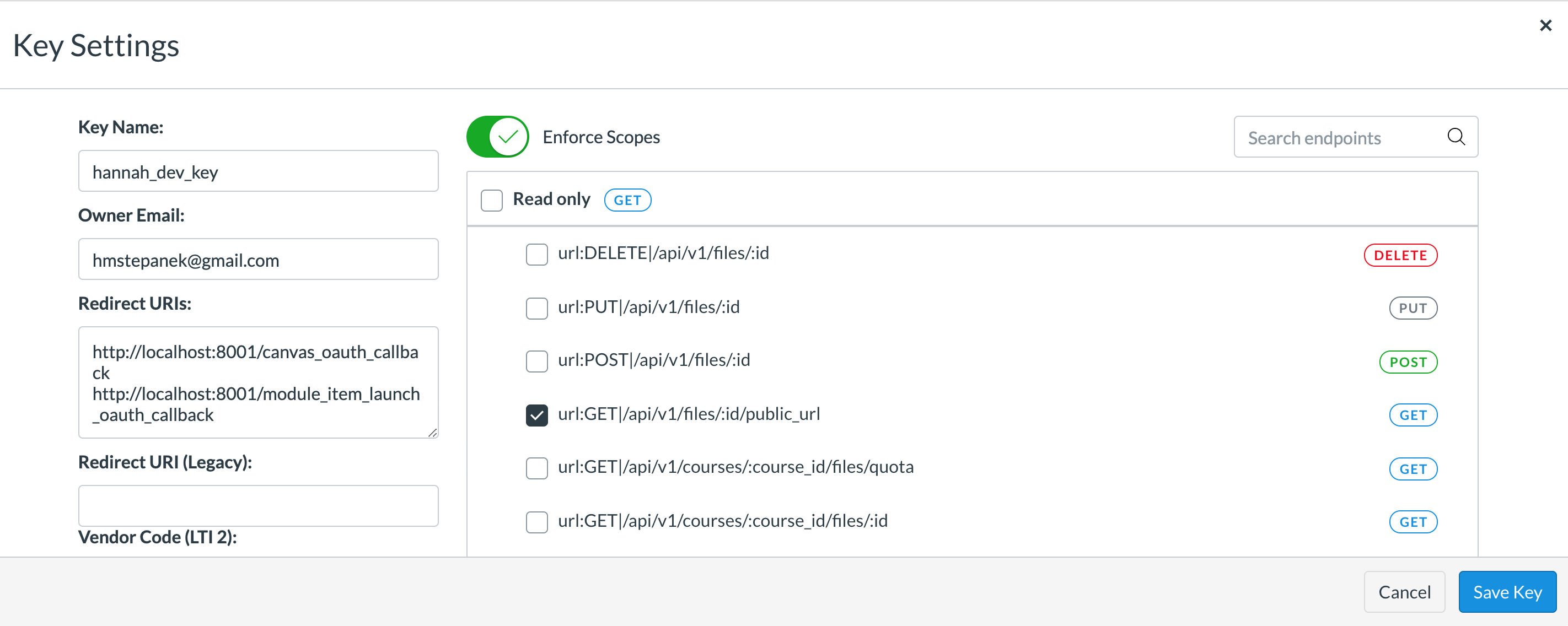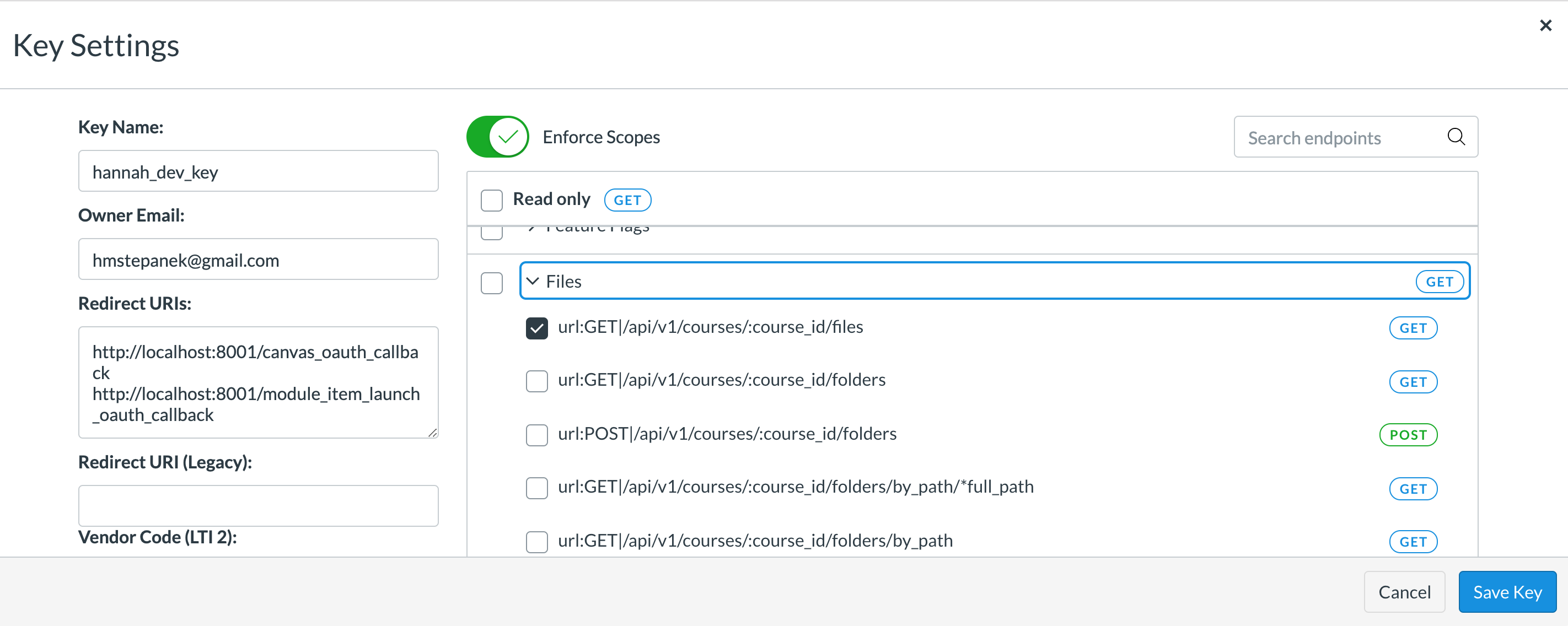 The use of scoped dev keys is not encouraged, as we might need to adjust the permissions/scopes needed by our app in the future as we continue to expand the functionality of our app. For those that institutions require the use of scoped dev keys, as of July 2019, here are the permissions currently required: