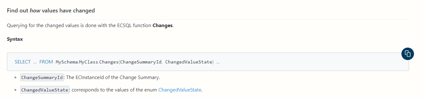 Hi, I'm using the below query to find the elements which have been updated in a given Change Summary. Does it still work if there have been no updates to the element's direct properties, but the element's aspects have been updated? Or would you need to run the query for all the aspect classes and link them to their associated elements?