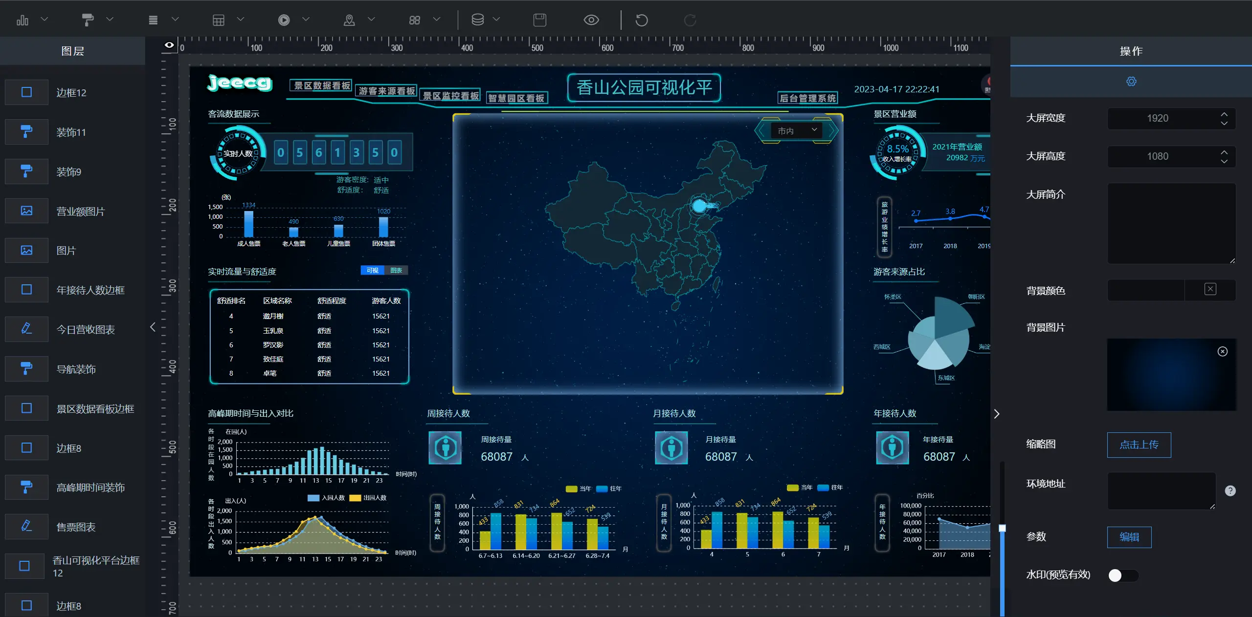 - 6.提供强大的报表和大屏可视化工具,支持丰富的数据源连接,能够通过拖拉拽方式快速制作报表、大屏和门户设计;支持多种图表类型:柱形图、折线图、散点图、饼图、环形图、面积图、漏斗图、进度图、仪表盘、雷达图、地图等。