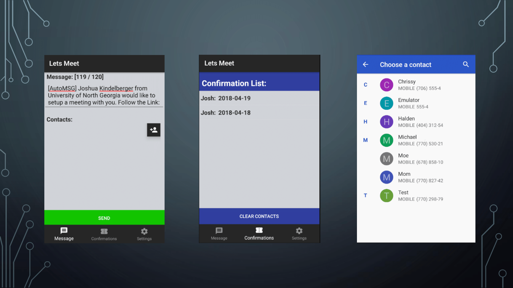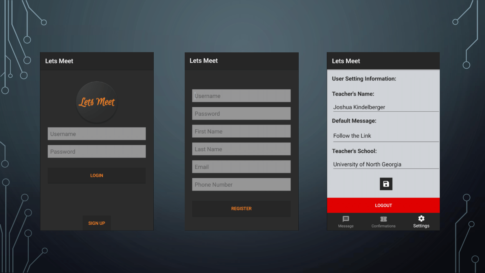 - Teacher can sign up & log in the mobile application. Write or auto-generate their message to send. Selects all contacts (parents) from phone and sends the message with an auto-generated link specific to the parent. Upon parent receiving the message, they will click the link to continue to confirm their appointment on Let's Meets website. Once confirmed, the teacher can see and manage all the confirmations inside the app.
