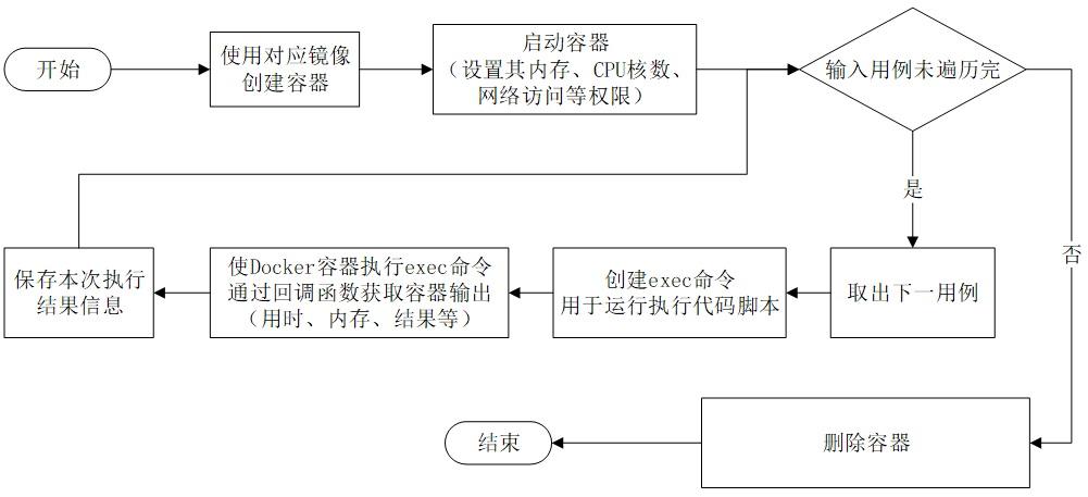本代码沙箱使用了第三方库Docker-Java来操作Docker,当需要执行代码,首先需要使用准备好的Docker镜像创建容器,然后启动容器,同时会设置容器的内存使用上限、CPU核数上限、禁止网络访问、文件系统只读权限等。在容器启动后,遍历输入用例集合,对于每个用例,都会被作为参数输入运行一遍代码,并且保存其运行结果、内存使用以及耗时等信息,运行代码是通过docker exec命令来实现的,使用docker exec命令执行准备好的Shell脚本,在Shell脚本中,会通过java命令运行用户代码,同时也会通过ps命令获取到用户代码运行进程占用的内存大小,并且输出。对于运行时间的获取,在系统中为每种编程语言提前准备了一个主类,在主类的主方法中对用户的代码进行了调用,而在调用的前后会获取到时间戳,最终即可计算出代码的运行时间并且打印输出。对于Docker容器的输出,主要使用了Docker-Java库提供的ExecStartResultCallback回调函数来获取,并且从中解析出运行结果、内存占用、执行耗时等信息,其中为了能辨别出内存占用以及执行耗时信息,打印时会在这两者的前后分别拼接上一个特殊字符序列,这样在识别时就能有效地区分了。直到把所有输入用例都遍历完,就会删除容器,并且返回执行结果。此外,对于代码沙箱使用到的Docker镜像,主要是使用了DockerFile为各种编程语言自制作了具有相对应环境以及具有前面提到的Shell脚本的镜像,这样一来,只要通过这些镜像启动容器后,就可以通过执行shell脚本来运行代码。代码的执行过程如下图所示。