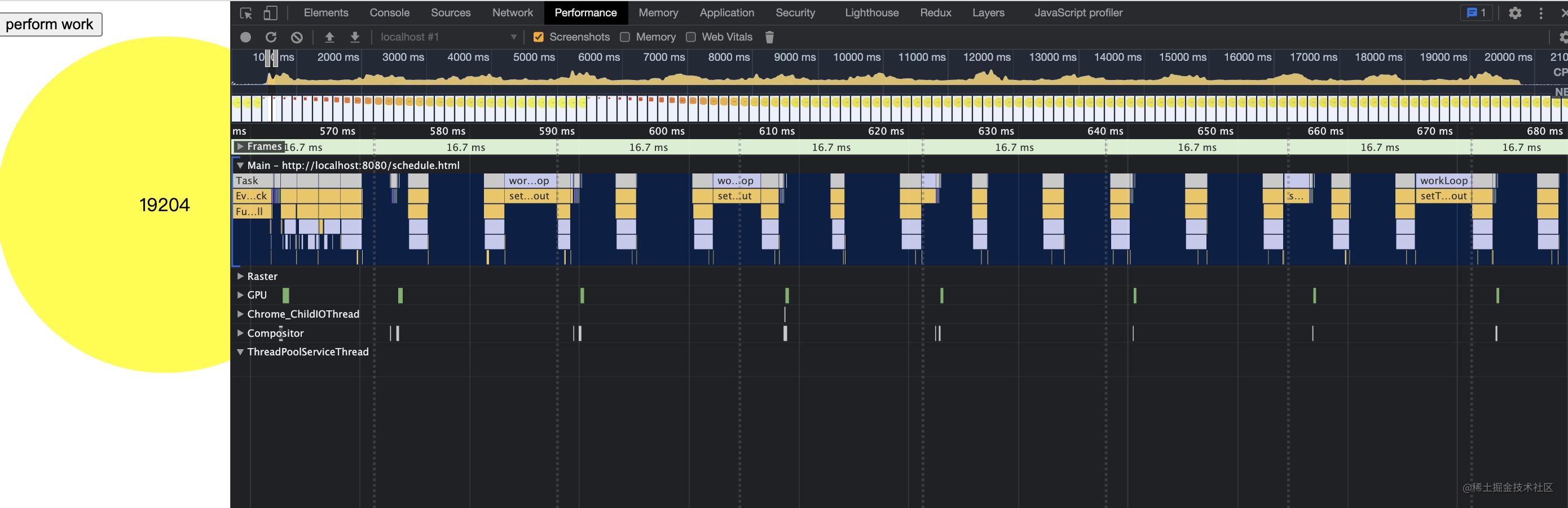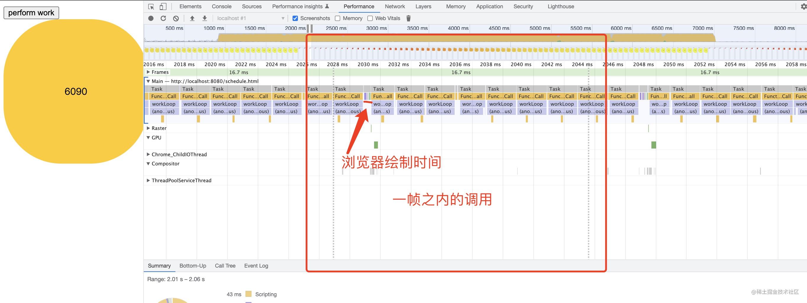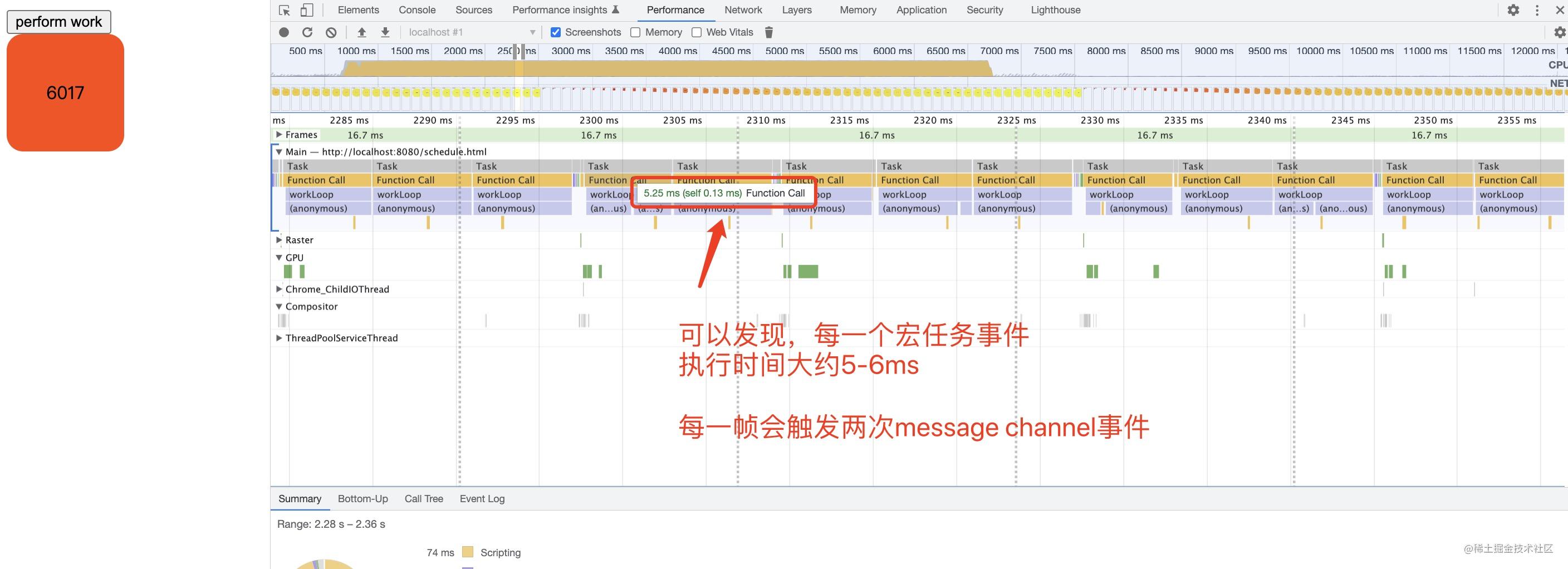 可以看到一帧之内浏览器的绘制时间,以及 message channel 触发的次数