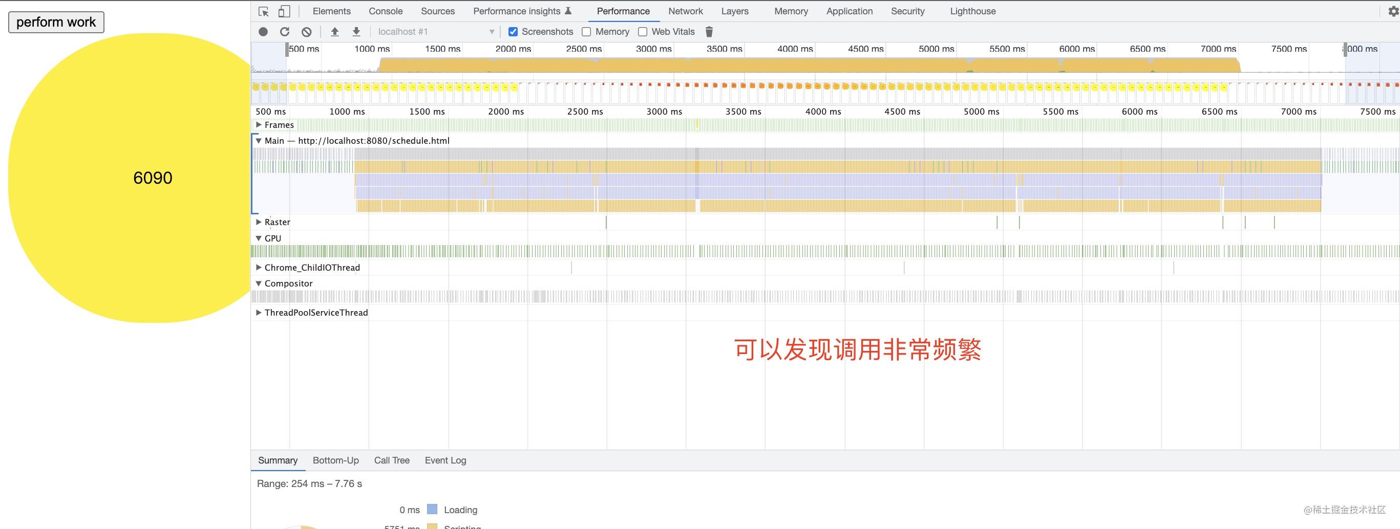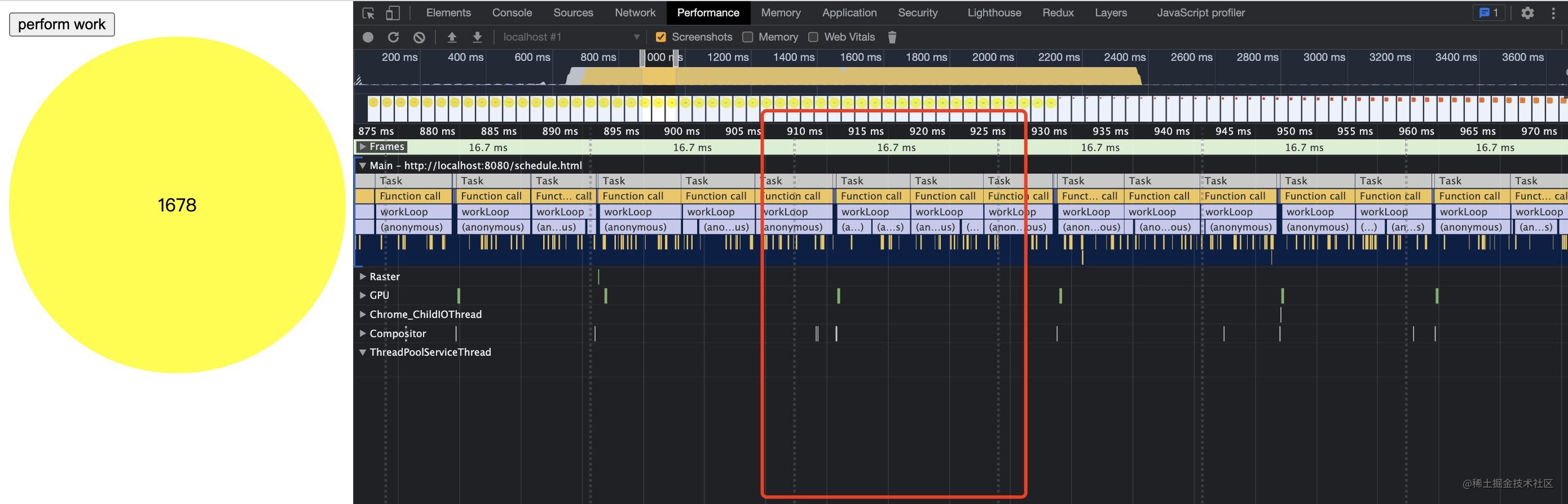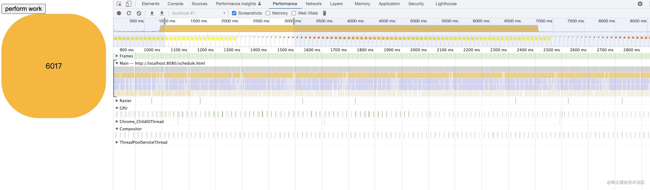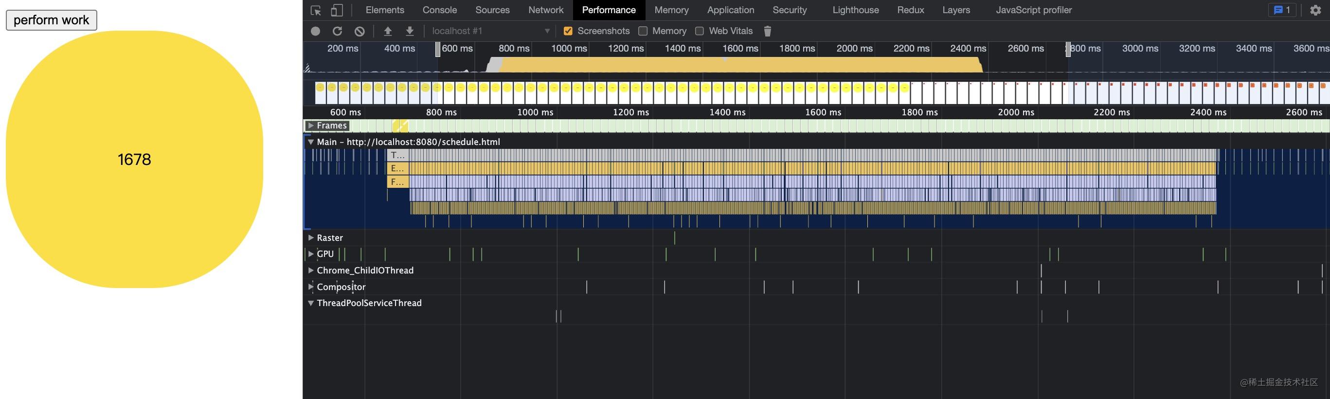 小李看了下 Performance。虽然使用了setTimeout(workLoop, 0)