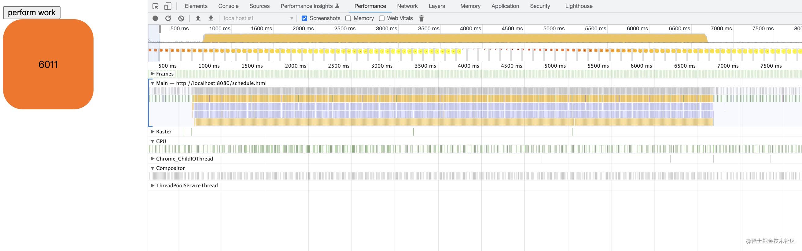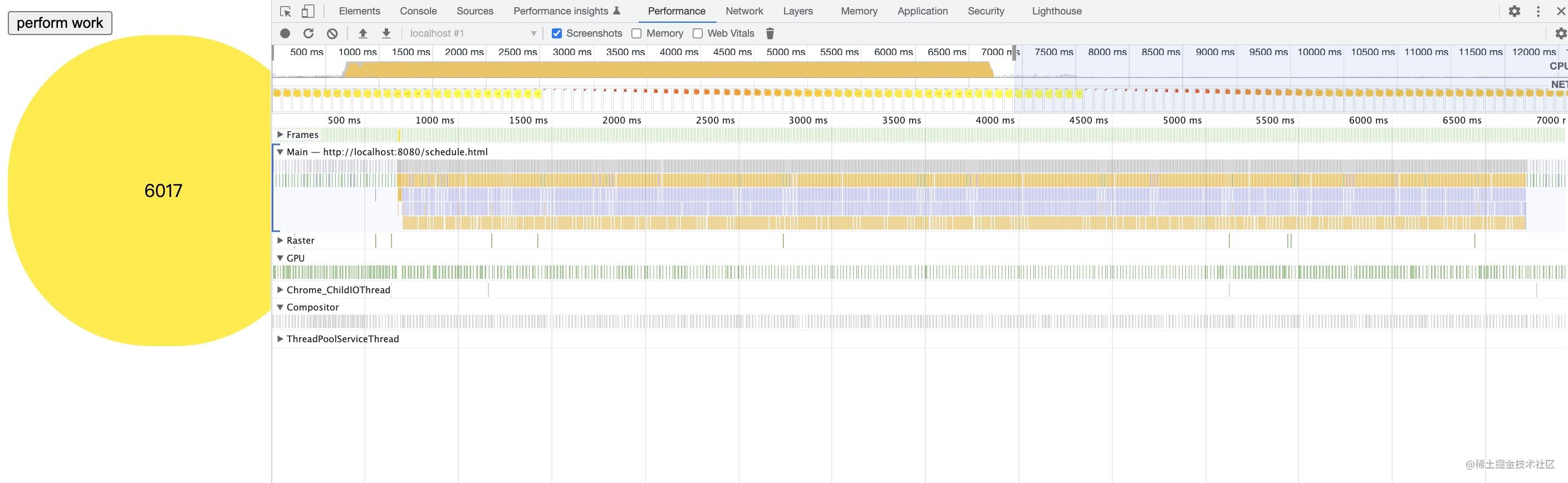 这次小李学聪明了,自测了下,效果如下,可以发现耗时只用了 6090 毫秒!!!为什么会多出了 90 毫秒?观察 performance 可以看出,虽然两次宏任务之间间隔非常短,但也会导致额外的开销,累积起来就有了几毫秒的差异。不过,这已经很贴近 6000 毫秒的执行耗时了,优势远胜于 setTimeout