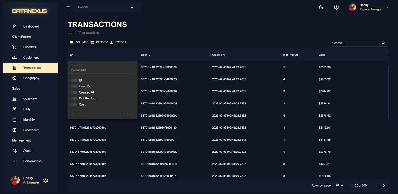 The Transactions Page is a feature-rich data grid that is used to display transaction data. It has features such as column control, density control, data export to CSV, and a search function.The data grid has columns for user ID, created at, products, number of products, and cost, and the cost column has a formatted display of the transaction cost. The data grid is contained in a box component with the title "Transactions" and subtitle "Entire List of Transactions". The data grid component is set to display the transaction data with properties such as loading, get row ID, rows, and data.