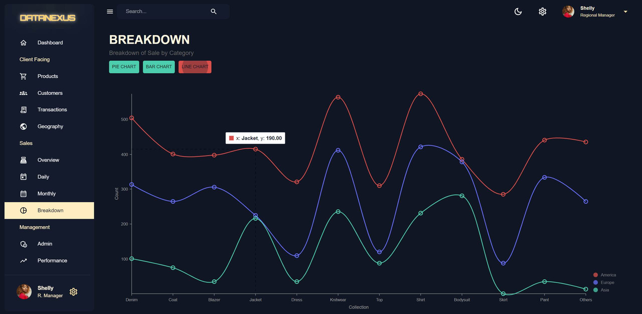 The Breakdown Page is a section in the dashboard that shows the sales breakdown by categories. The breakdown chart is a pie chart that displays the information split into categories. The chart information is displayed in the middle to show the total amount of sales. The breakdown chart is created as a separate component in the