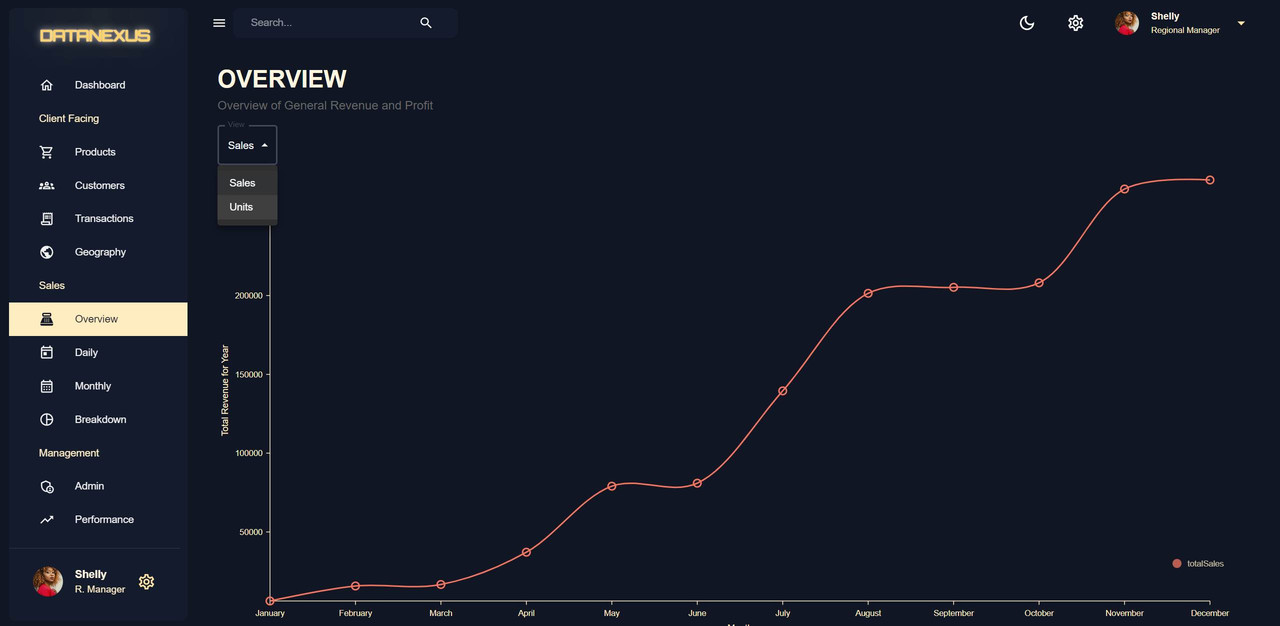 The Overview Page displays the overall revenue and profit of the year. It has two different views: units and sales. The data includes total customers, yearly sales total, yearly total sold units, year, monthly data, and sales by category. This data is saved in the MongoDB database and can be retrieved through an endpoint named