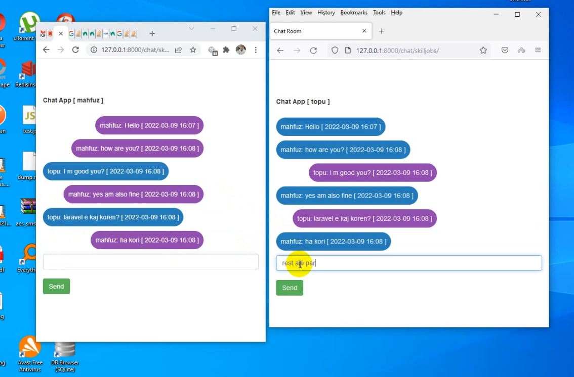 - go to localhost:8000/chat and type chatroom and using same chatroom on different browser keep chatting