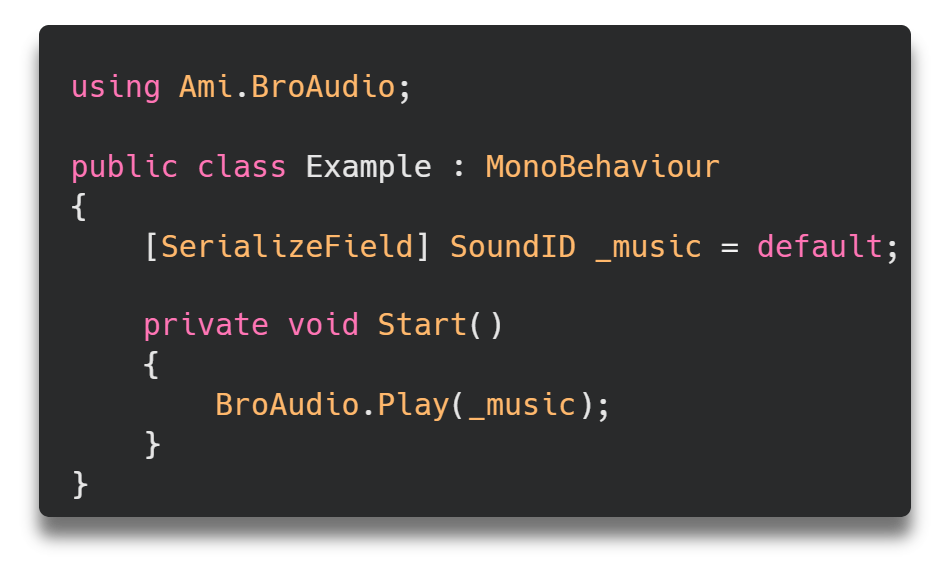 BroAudio is a sound management and playback system designed for Unity. It's unique in its focus on sound quality and a developer-friendly experience. You can create extensive and captivating audio systems without the need for mastering complex middleware like FMOD or Wwise. Whether you're part of a large team or a solo developer, achieving the goals becomes effortless and efficient with BroAudio.