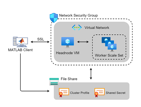 - Head node VM (Microsoft.Compute/virtualMachines): A compute VM for the cluster head node. The MATLAB install is part of the VM image, and the job database is stored either locally on the root volume or on a separate data disk. The head node communicates with the clients using a secure SSL connection.