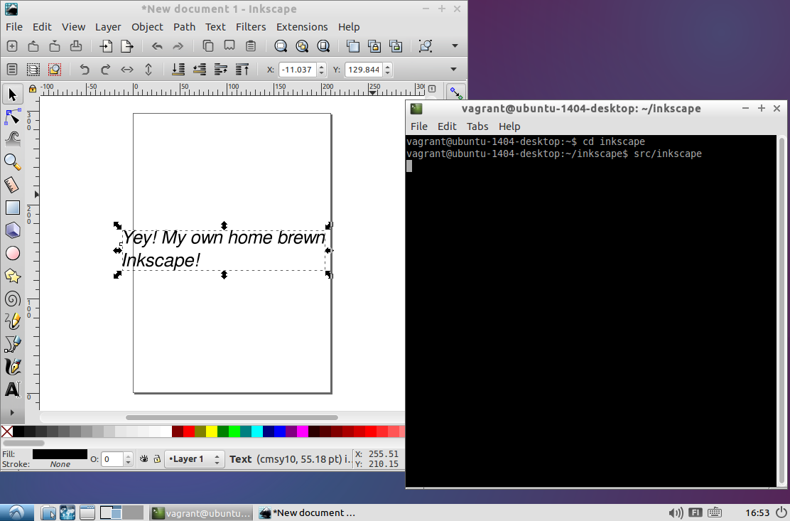 Also during that weekend, I started writing this Vagrantfile, so the effort could be re-used for someone else and lower the threshold to build Inkscape from sources. It also means restarting development a breeze, e.g. if you re-install your OS or switch computer.