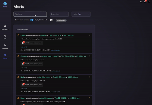The alerts icon will lead you to a closer view of your Alerts allowing you to filter by table name, column name, monitor type, and status. This will be where you have the option to click to see anomalous rows. You can also add notes, mark alerts as resolved, and clear resolved alerts by clicking on the x at the top right of the Alert component. Once Alerts have been dismissed, they will no longer display by default, but you can click the toggle on this page to see those you have dismissed as well as those that you haven’t gotten to yet.