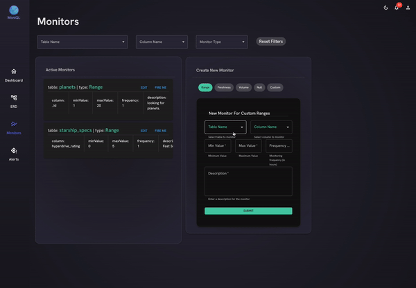 The monitors icon will take you to the engine of MoniQL’s core monitoring functionality where you can view and edit a list of your active monitors. You can also filter monitors by table name, column name, and monitor type. On the right side of the screen, you can choose a type of Monitor to create—-so far we have full stack functionality for Range Monitors, Null Monitors, and Custom Monitors, and for each you can decide how often you’d like them to fire automatically, or you can fire at will with a button click. Range Monitors allow you to pick a minimum or a maximum value, or both, for any column that contains numbers, and set off an alert whenever a number outside of your chosen range is found. Our default Null Monitors look for null values in any column on a given table. And perhaps most useful to devs like yourself, our Custom Monitors allow you to enter whatever SQL query you’d like, set up to return anomalous values, and automatically check your database for such values at time intervals of your choosing. When one of your Monitors finds anomalous values on a table of yours, MoniQL will create an Alert, and update the bell icon in the upper right corner of your window.