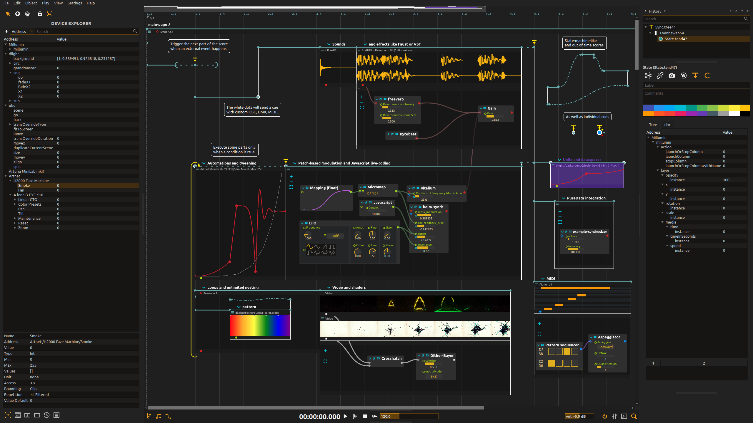 Sequence OSC, MIDI, DMX, sound, video and more, between multiple software and hardware. Create interactive and intermedia scores, script and live-code with JavaScript, ISF Shaders, Faust, PureData or C++. Leverage IoT protocols such as CoAP or MQTT, interact with joysticks, Wiimotes, Leapmotions, Web APIs and BLE sensors and integrate programs from a wealth of creative programming languages such as Structure Synth, Context-Free Art and Bytebeat. Load any kind of audio or video format and process visuals through Spout, Syphon, NDI, Shmdata or Sh4lt ; sonify large datasets with CSV and HDF5 support.