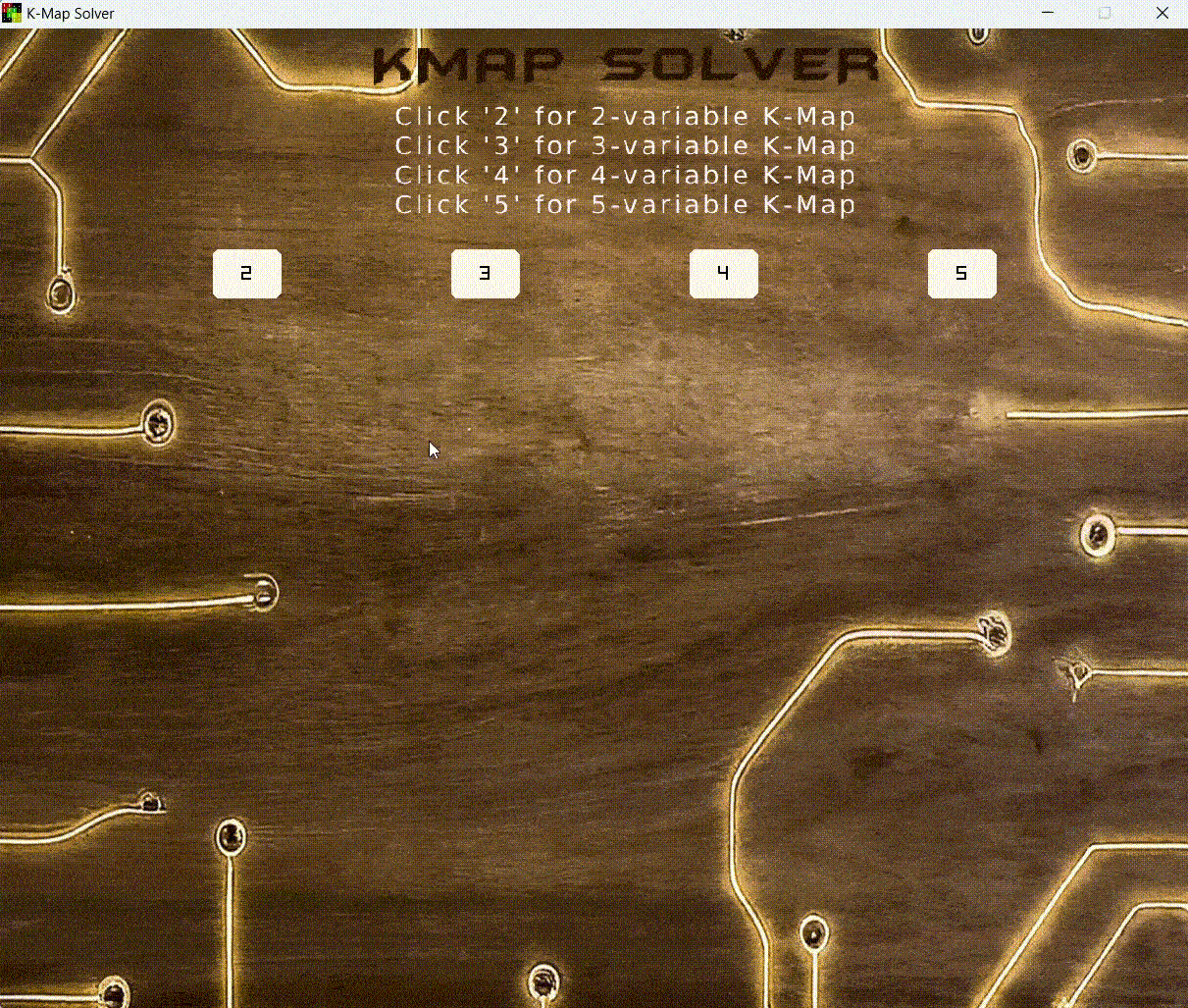 This project contains a robust and efficient KMap Solver developed in C++. The project utilizes the Raylib library to provide a visually appealing and user-friendly graphical interface, making it easy to input, manipulate, and visualize Karnaugh maps.
