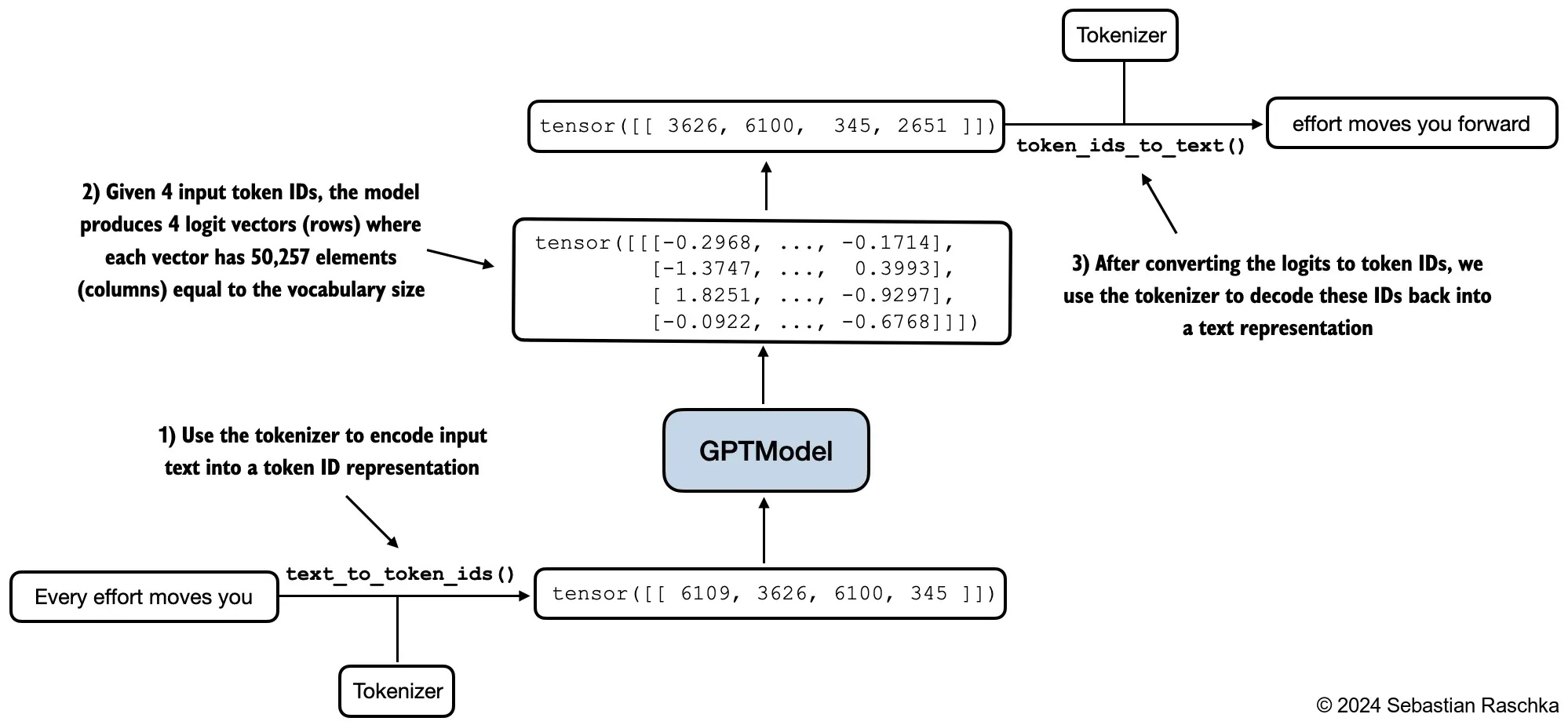 In the step2, why each vector has 50,257 element? I think 50,257 is the size of vocabulary and the size of each vector should be the dimension of embedding, like 768 in this example.