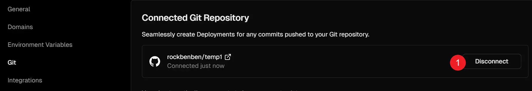 当前的 Vercel 页面仅用于演示,并不会随项目自动更新。请依次选择「Project Settings」>「Git」>「Connected Git Repository」,点击「Disconnect」,然后点击 GitHub 图标,选择第一步中的「你的用户名/仓库名」,并点击其右侧的「Connect」按钮。