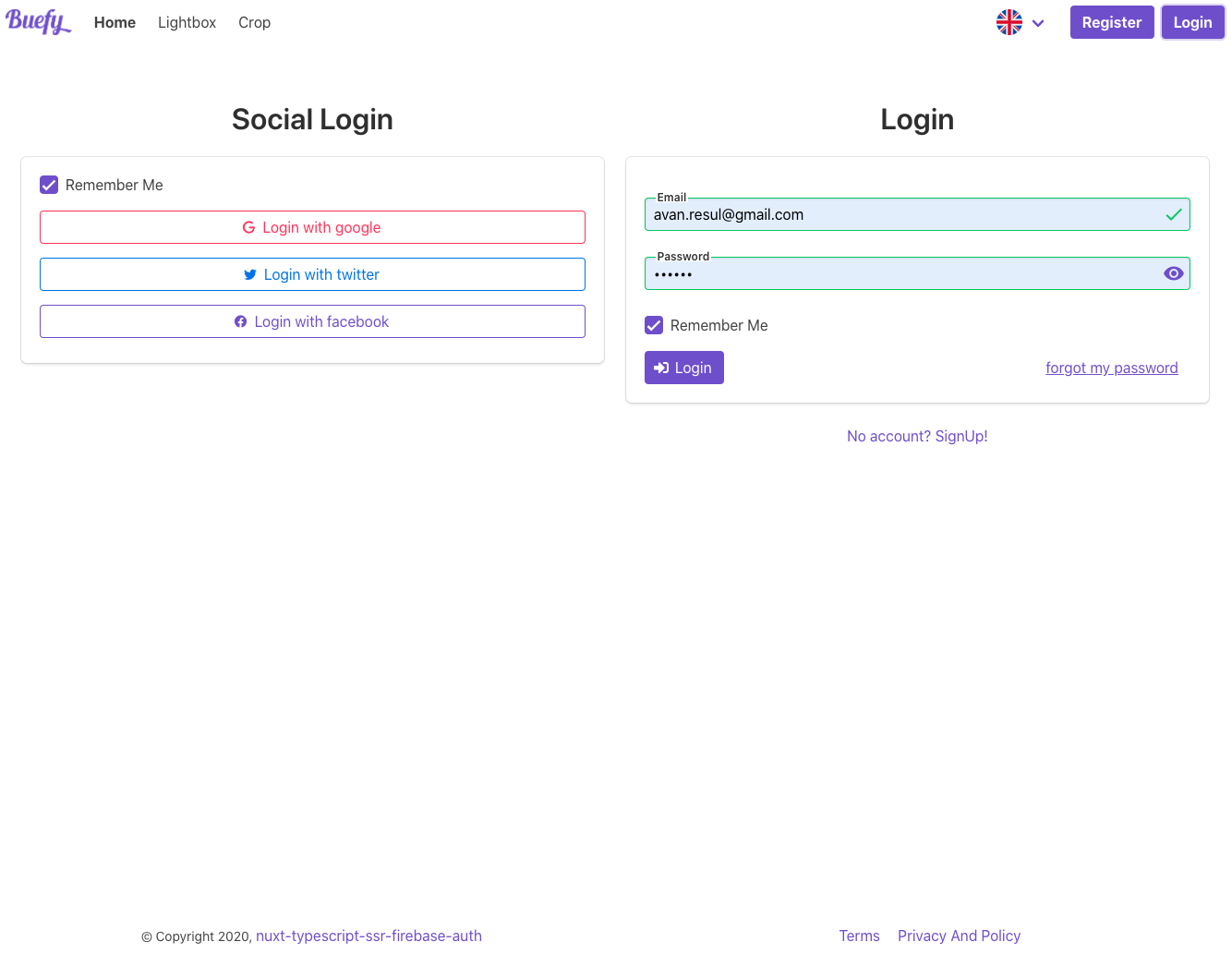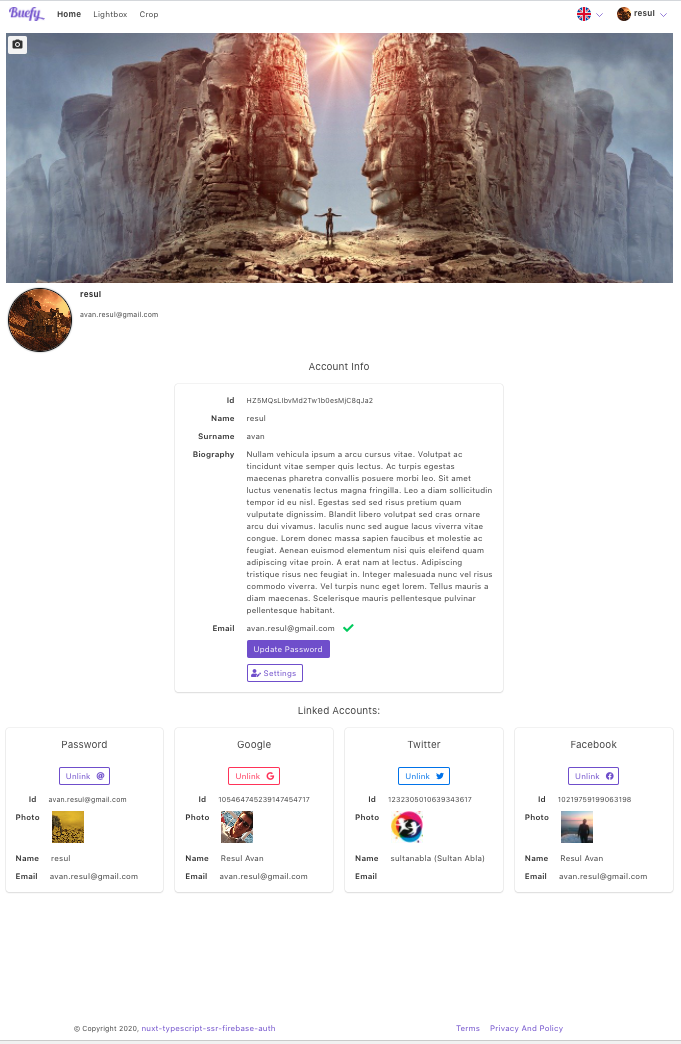 Firebase full password authentication (register, login, forget password, reset password), google authentication, twitter authentication, facebook authentication in nuxt