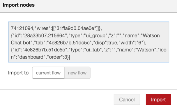 Same way you imported the code in the previous step, copy the following text and import it in Node-RED. In this case use NodeRED-CustomClassifier.txt