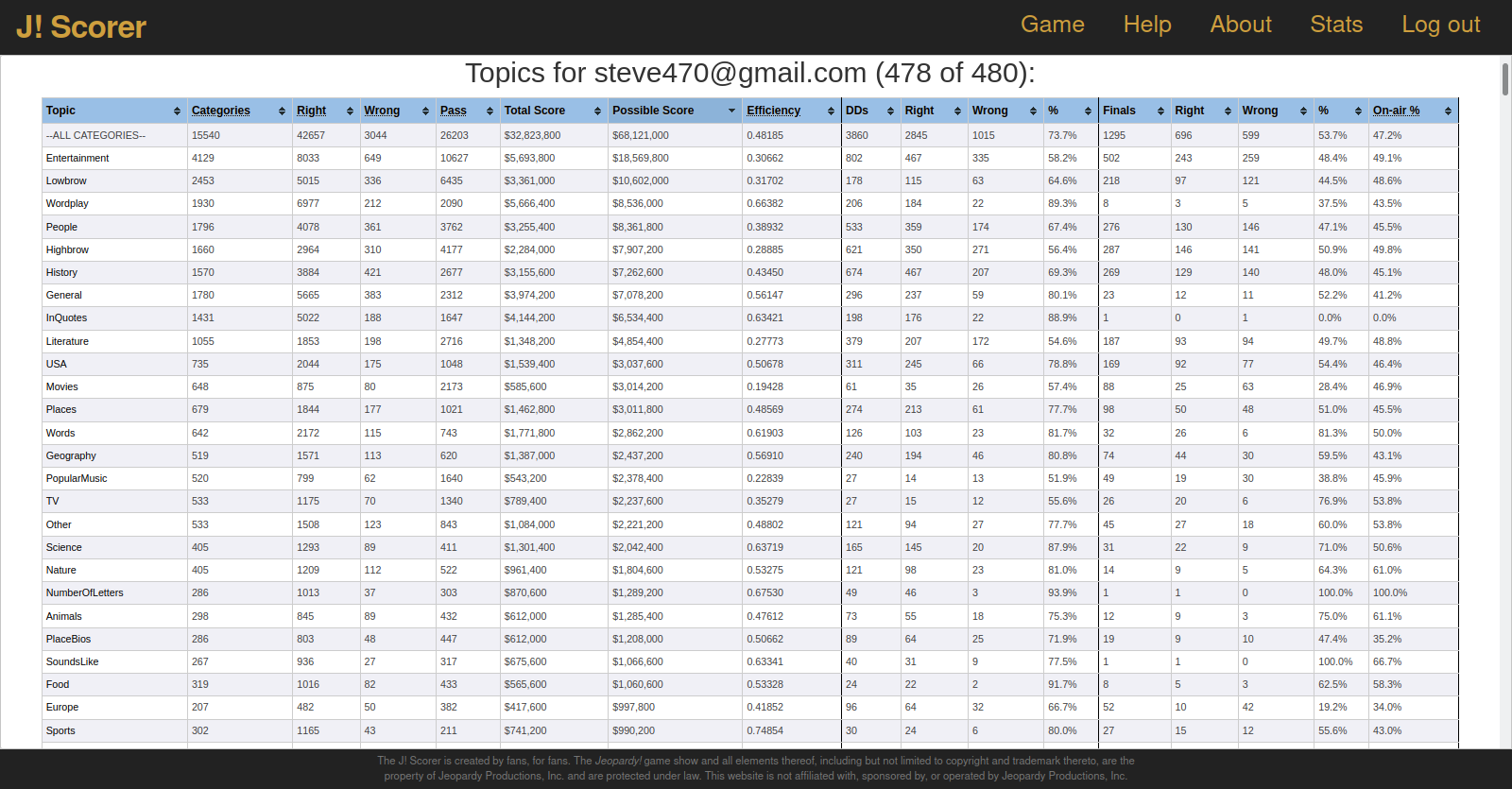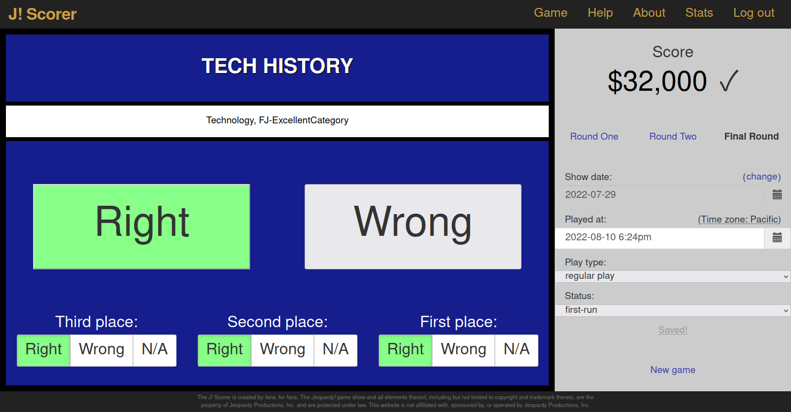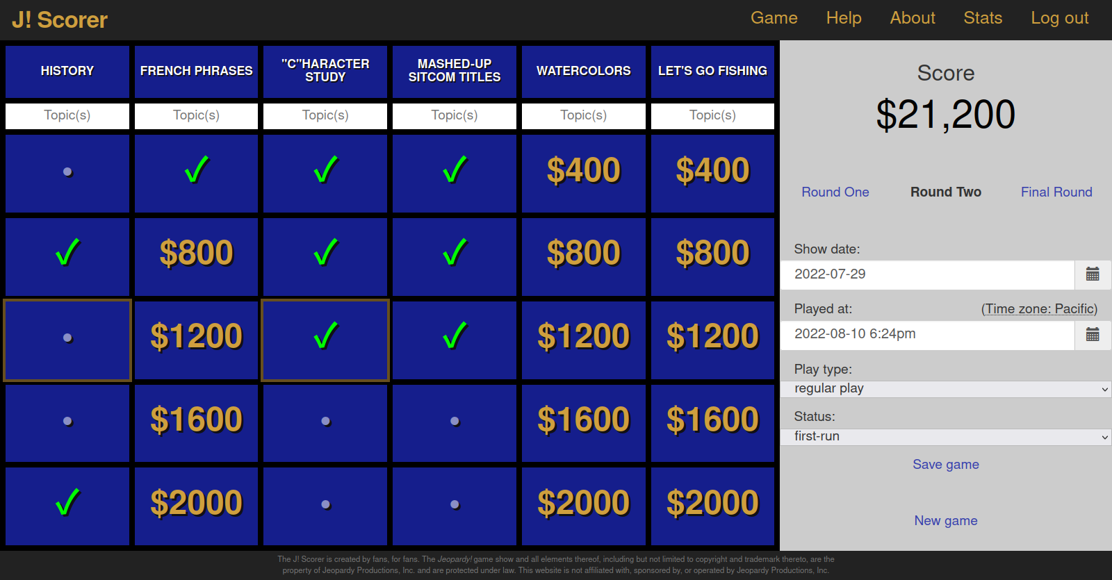 The J! Scorer is a web app that makes it easy for prospective Jeopardy! contestants to keep score along with the show, and track their training progress via a bunch of different stats.