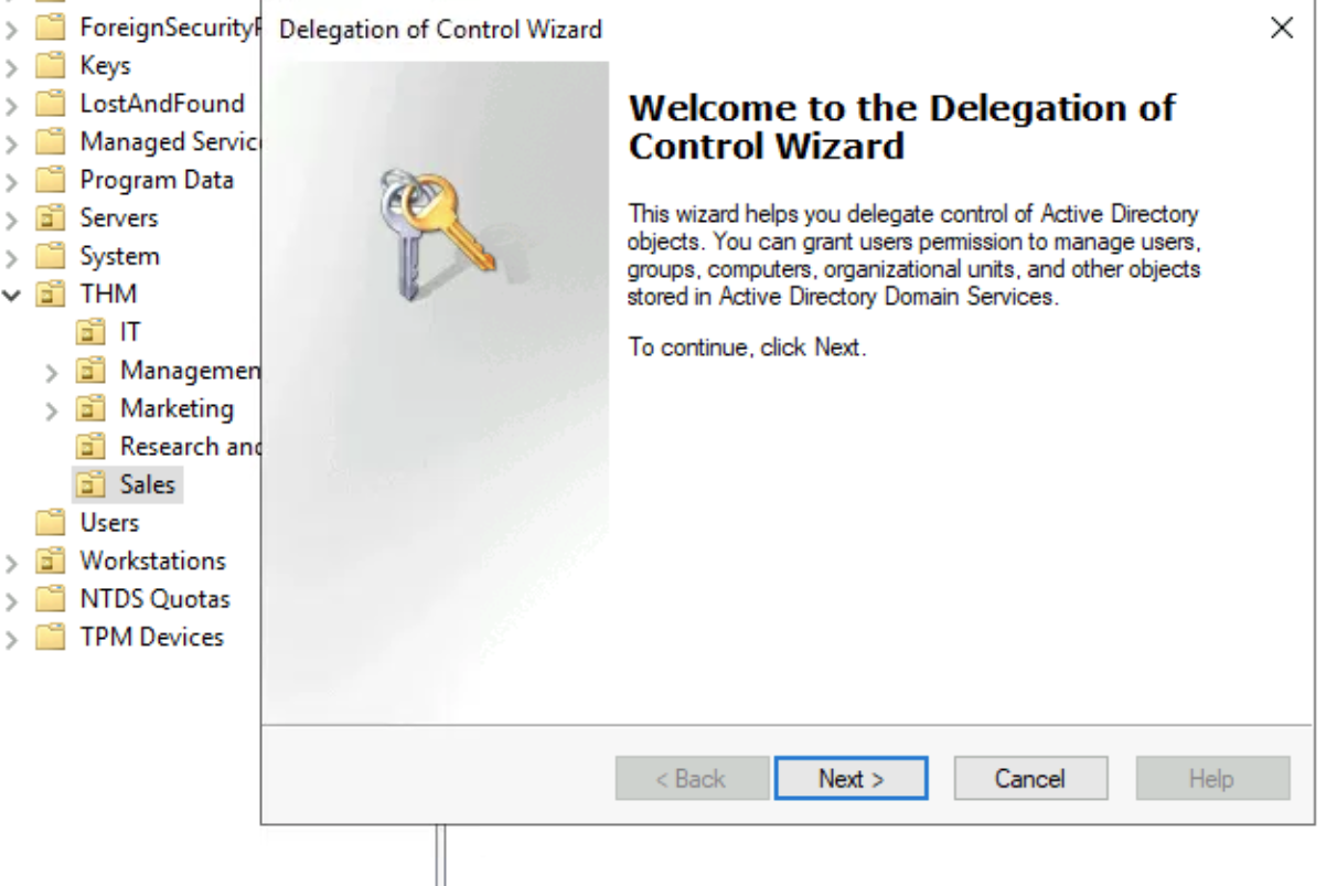 To Delegate control of a OU, or give privileges to certain users (giving IT privileges to reset passwords for the sales dept. for example) you must right click the OU and right click Delegate Control. There another popup appears where you click next and are able to give access to users or groups and specify what privileges they get to recieve.