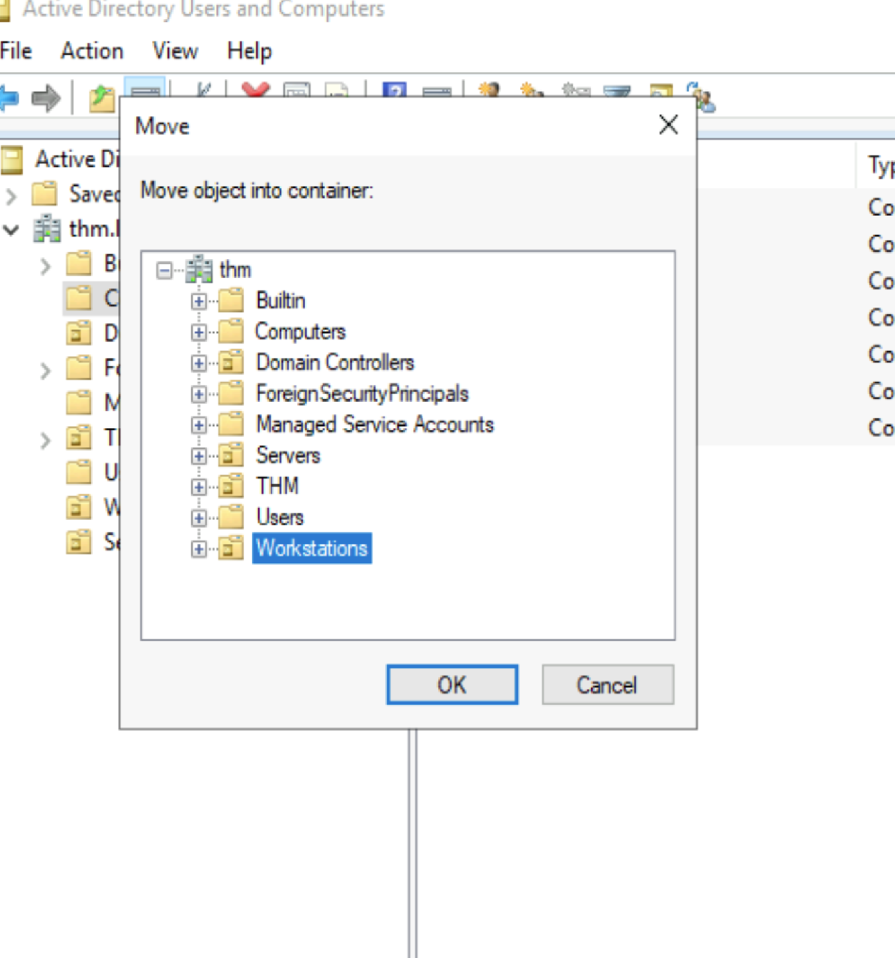 To Create a new Organizational Unit (OU), go to Active Directory Users and Computers and then right click the domain (in this case THM) and select new, then Organizational Unit.