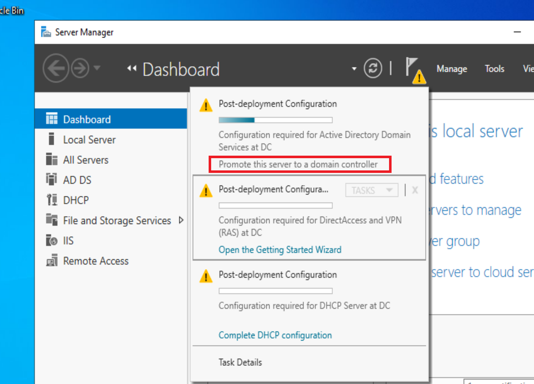 Now go back to the Server Manager yet again to set up the Dynamic Host Configuration Protocol (DHCP) on the DC based on the Diagram Specifications.