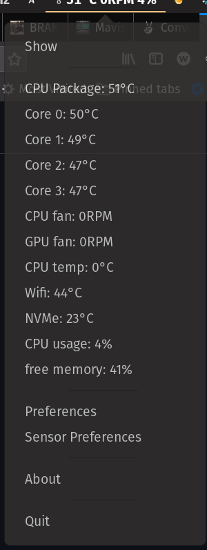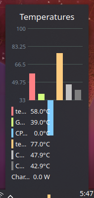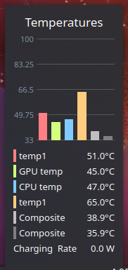 @MilesBHuff you know, I actually observe the same behavior as you, but I am able to obtain the PECI temperature via coretemp rather than system76_acpi. In this screenshot, the lower "CPU temp" that reads 0C is from acpi and notably, there's an acpi reading for GPU temperature as well, but it's always been 0C and I've kept it hidden. I'm using a pSensor Ubuntu .deb from the pop store FWIW. |