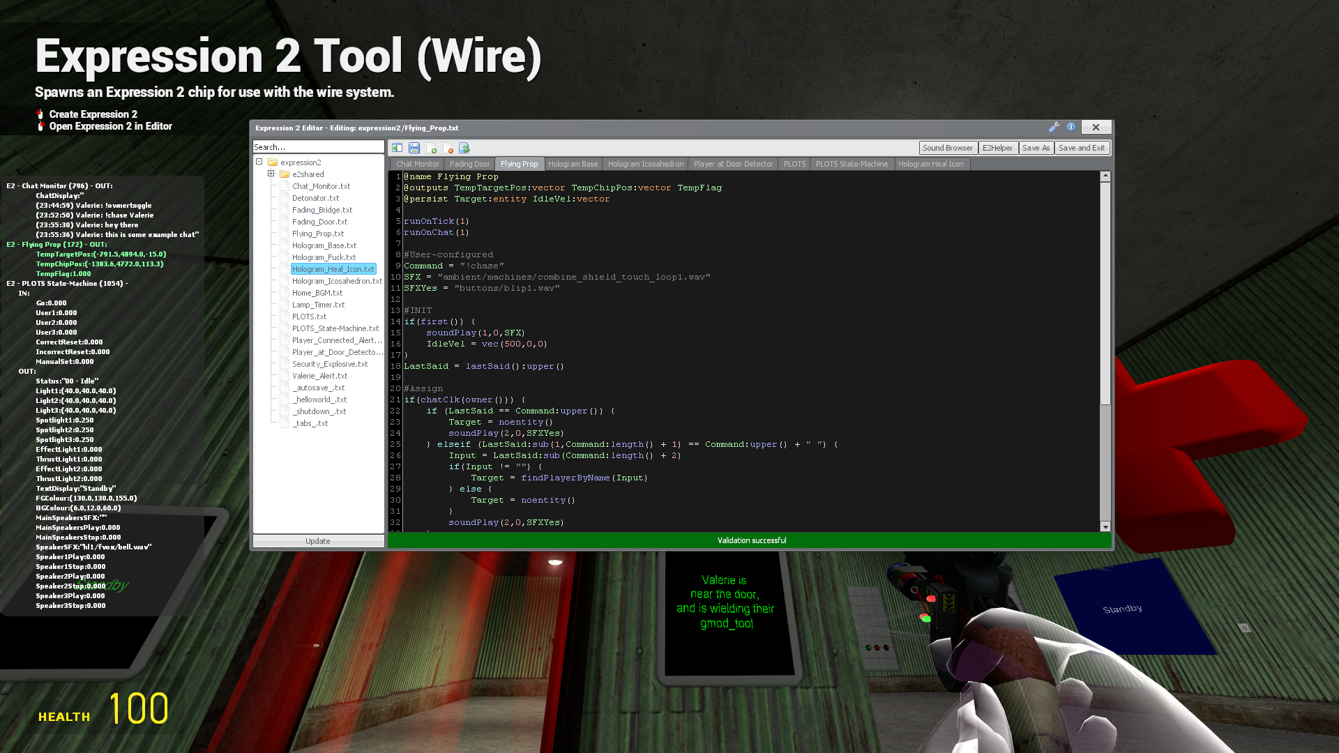 Expression 2 is an interpreted language that could be described as a mix of C and Lua. It is a powerful way to interact with the game, being able to spawn entities, remotely apply forces, and has full knowledge of and access to all of the entities and players on the server.