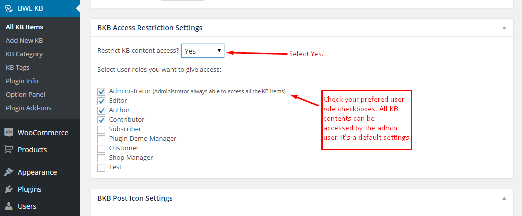 At bottom of the Edit Page, you will find a section BKB Access Restriction Settings. In that section, you will get options to set Knowledge base post access restriction settings. Finally click save/update button.