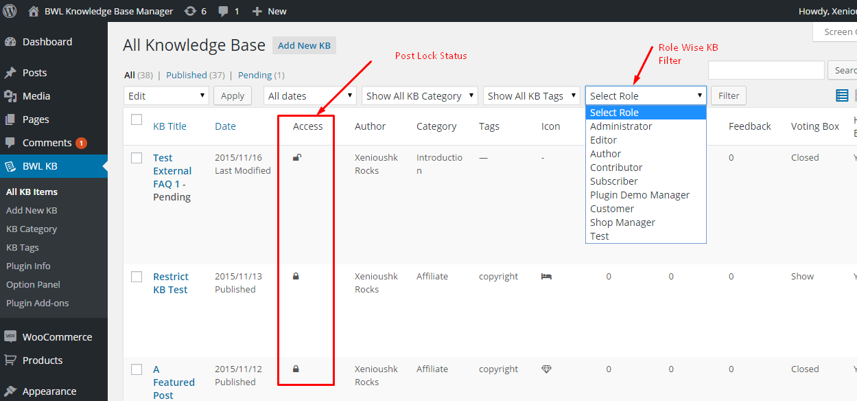 The Administrator panel allows you to filter posts by the user role. This provides you with a comprehensive overview of post access based on user roles. Also, in the custom column, you can see the Knowledge Base post locked/unlocked status.