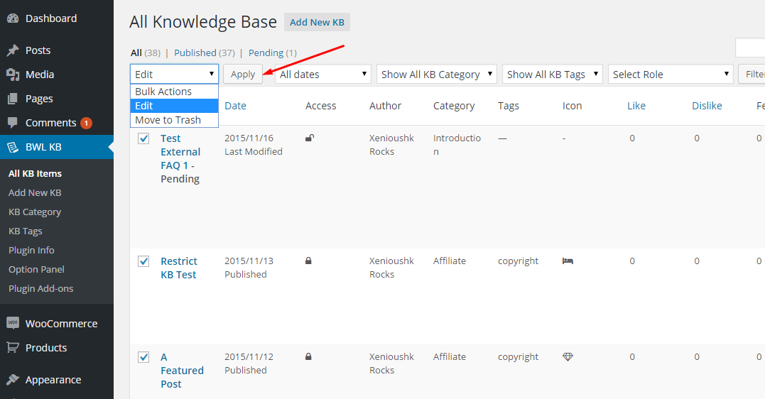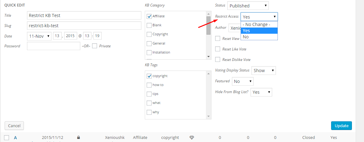 You can also use the Quick/Bulk Edit option to set restrictions for multiple posts. To do this, go to the All KB Items section, and then when you hover your mouse on any post, you will get a Quick Edit link. Click on it, and you will see an option to set access restrictions. Select your preferable option and click Update.