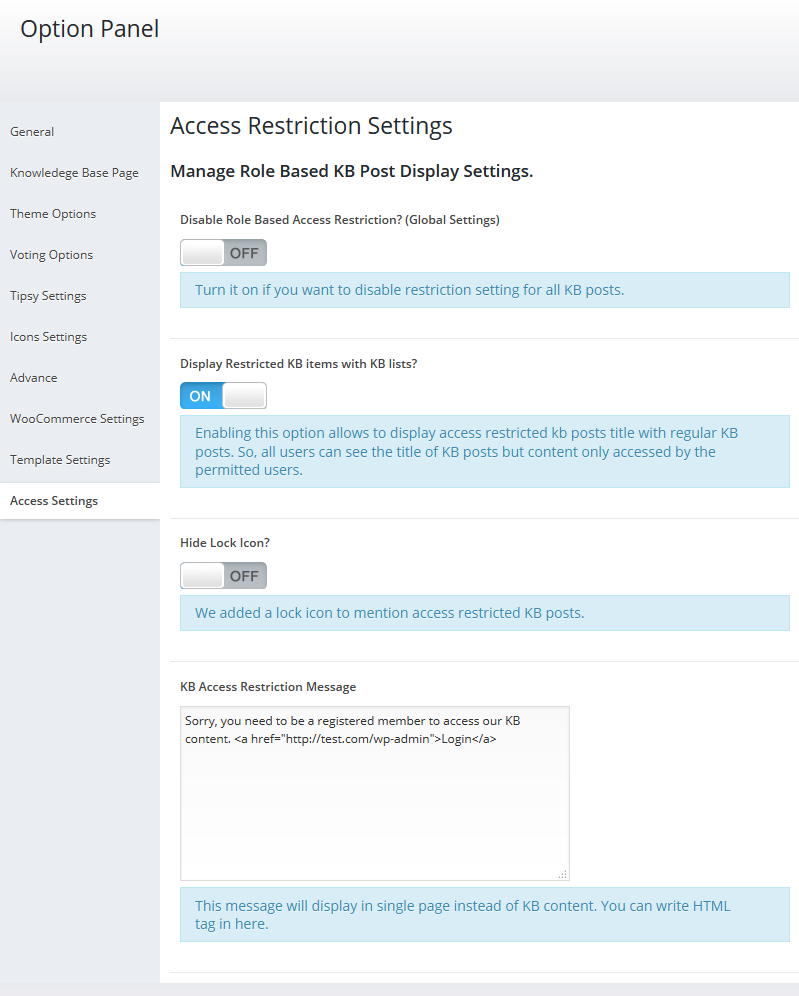 Addon has an extensive options panel that allows you to manage global restriction settings, restricted item display settings, lock icon display settings, and custom message for locked content settings. Addon automatically manages your sidebar knowledge base contents, related knowledge base contents, and custom knowledge template contents.