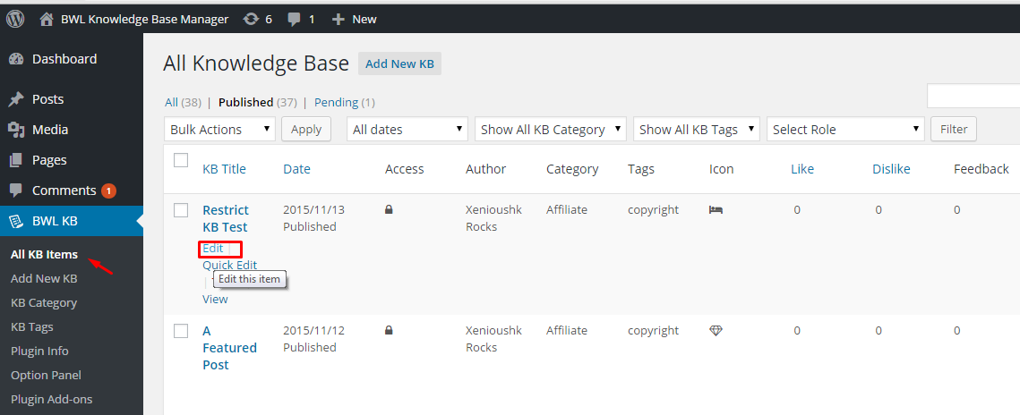Go to All KB Items, and select A Knowledge Base post that you want to lock.