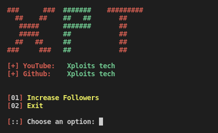 XPT Best Tool For Increase Instagram Follower. Requirements openssl curl How to Install in Termux $ pkg up -y $ pkg install openssl-tool $ pkg install curl $ pkg install git $ git clone https://github.com/xploitstech/xploits $ cd xploits $ chmod +x xploits.sh $ termux-wake-lock $ bash xploits.sh • subscribe Below for the next script https://www.youtube.com/channel/UC4K7LoYkJkKvDrtqg5LBa6w Follow Me On
